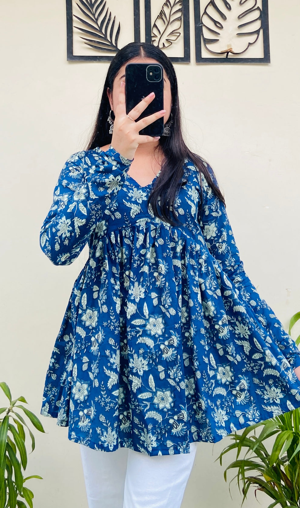 Cotton Flared Royal Blue Aliacut Floral Print Peplum Top