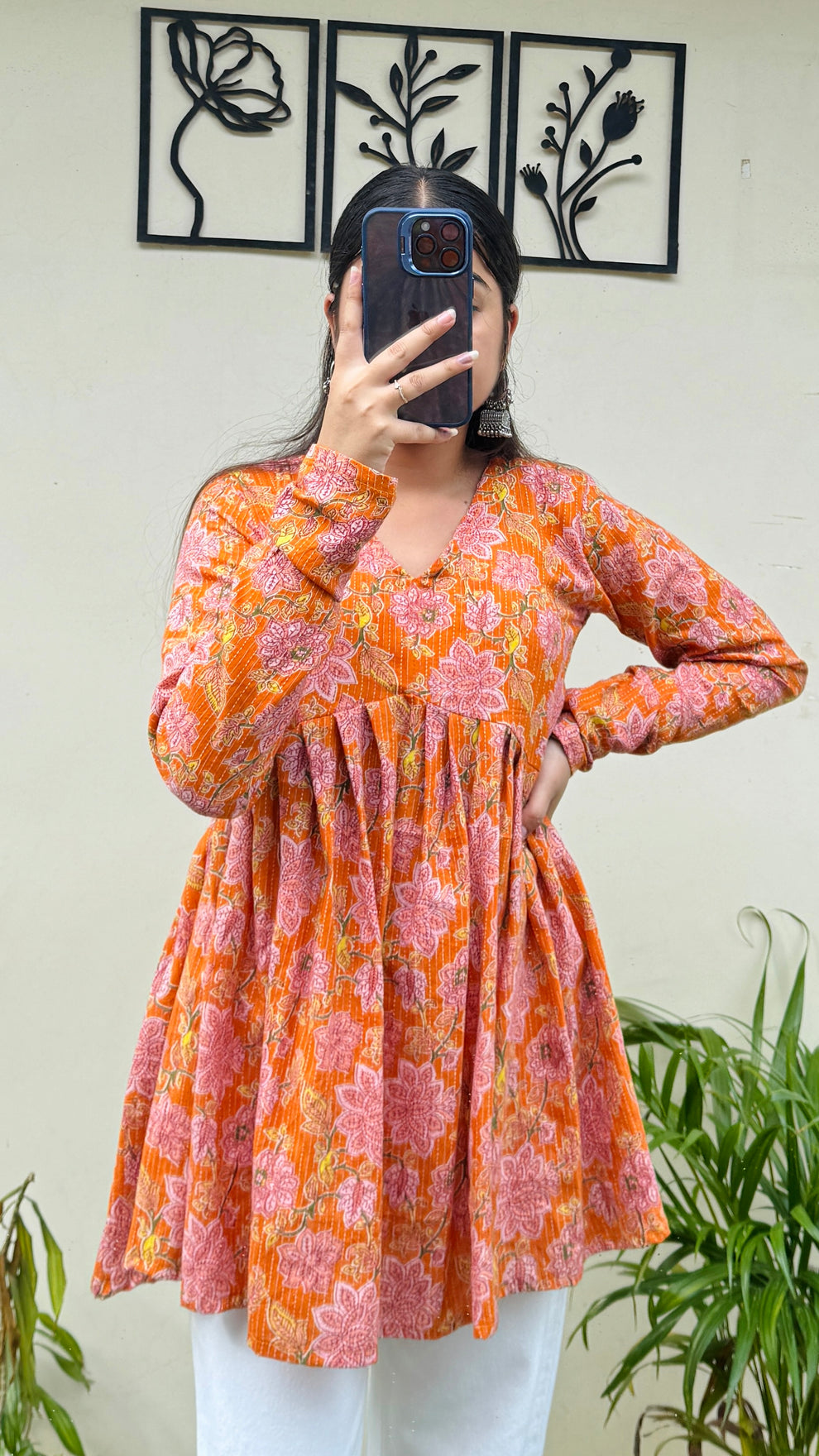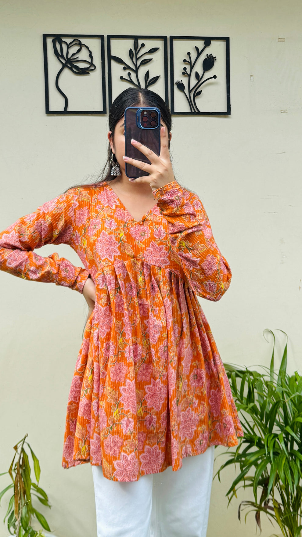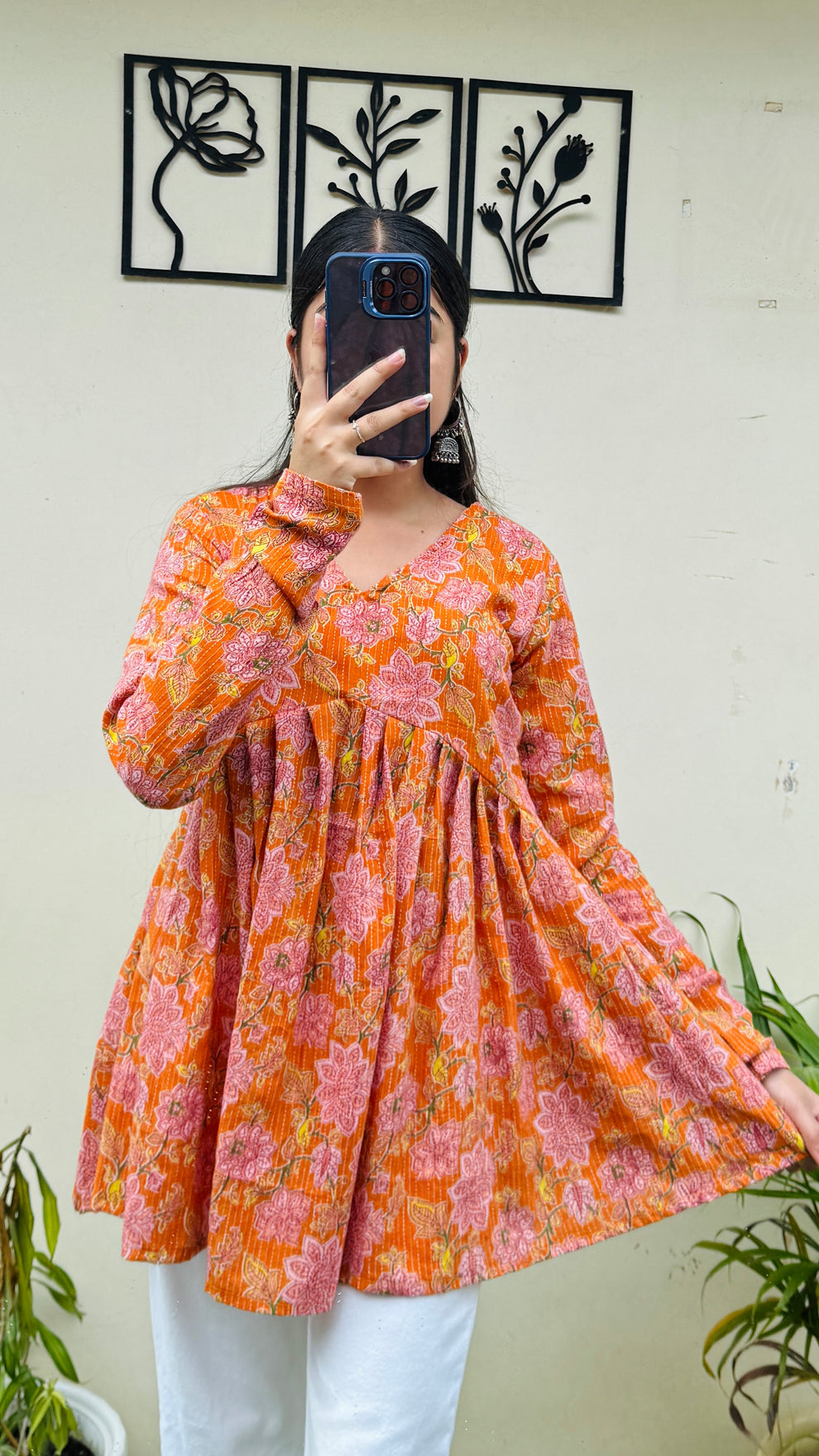 Katha Cotton Orange Flared Floral Print Aliacut Peplum Top